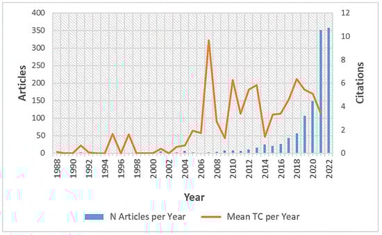 Article citation analysis is the most widely used method to study the impact of authors, journals, and articles, as it identifies the key works in a research area []. Overall, on average, every document had 9.53 citations based on the global citation counts using Scopus data. Along with the total increase in the number of published documents over time, a parallel increase in the average number of citations per year was observable (see Figure 2).