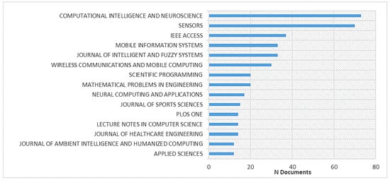 Overall, the reviewed documents were published in 428 different journals. The 15 most productive journals in terms of the number of published documents are presented in Figure 3. The top 10 journals are responsible for 28.64% of all published documents. The most productive journal was Computational Intelligence and Neuroscience (h-index: 61; 2021 impact factor: 3.64), followed by Sensors (h-index: 196; 2021 impact factor: 4.35) and IEEE Access (h-index: 158; 2021 impact factor: 4.34). It is notable that the top-ranked journals include not only journals with specific aims and scopes, but also those with a broader possible range (e.g., PLOS ONE). However, journals that focus on information technology and engineering comprise the majority. This indicates that AI in sports is interdisciplinary because most journals do not focus on sports. The Journal of Sport Science is only ranked 10th, which can be taken as a sign that AI is not the main topic in sports science at all.