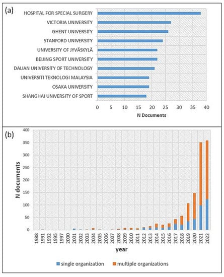 With 38 articles, the Hospital for Special Surgery (New York City, NY, USA) takes first place among the most productive organizations, followed by Victoria University (Melbourne, Australia) and Ghent University (Ghent, Belgium) (Figure 4a). Surprisingly, although China is the most productive country in terms of publication output, the leading Chinese university only ranks in sixth place (Beijing Sport University). This indicates that many institutions in China seem to be involved in the publications without any individual institution being particularly active. The aforementioned high proportion of single authorship in Chinese publications, without collaborations between institutions, also appears to be related to this.