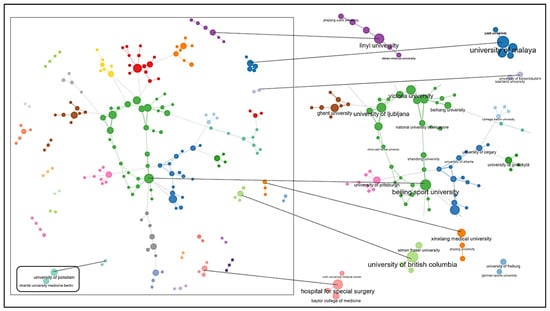Collaboration network of the organizations based on the selected 1215 documents using the bibliometrix package (parameters: Walktrap clustering algorithm). For visualization reasons, the maximal number of nodes was limited to 200. Exemplary subnetworks are also presented, zoomed in with the names of exemplary organizations for visualization reasons.