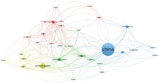 Examination of the international collaboration, which indirectly depicts the connections of the authors from different countries, shows that five clusters of collaboration groups are present (Figure 6). The top three most productive countries (i.e., China, the USA, and Germany) are in different clusters. In the blue cluster, the most productive countries are China, the Republic of Korea, and India. In the yellow cluster, the USA is the most active country, followed by Spain and Canada. In the red cluster, the most productive countries are Germany, Turkey, and Japan. In the green cluster, the United Kingdom is the leader, followed by Australia and Slovenia. It is striking that geographic proximity is a strong explanatory factor but is not necessarily related to cluster affiliation. For example, Germany collaborates strongly with the nearby countries of the Netherlands and Belgium, but also with Japan. The same applies to the cooperation between the USA and Spain.