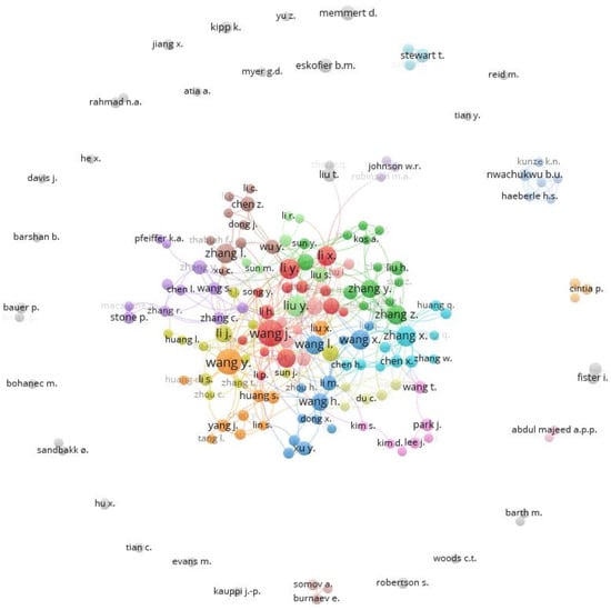 The research field of AI in sports is characterized by a large number of authors. In total, 3411 different authors published their works during the period of time investigated in this review. Only 188 authors of single-authored publications were present. On average, each publication shows 3.65 co-authors, and 21.15% of the papers are written by international author groups. The majority of the most productive authors are located in China. Due to the relatively high level of correspondence between names according to the country-specific characteristics in China [], the most productive authors are not presented here so as to rule out any possible errors or injustice since authors were not identified on the basis of a clearly identifiable ID (e.g., ORCID ID) but on the basis of their first and last names which, due to the abovementioned situation, may have led to an incorrect merging of authors with the same first and last names. However, as it is reported that co-citation analysis is relatively immune to author name ambiguity issues [], the corresponding mapping was performed to reveal the social structures of the authors (Figure 7).