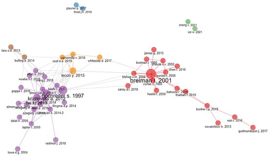 The co-citation analysis revealed the presence of six clusters (see Figure 8). Two clusters were not connected with other clusters (shown in green and blue). The overall most cited publications in the clusters were those of Breiman (2001) with the random forest algorithm [] and Hochreiter and Schmidhuber (1997) with long short-term memory (LSTM) [].