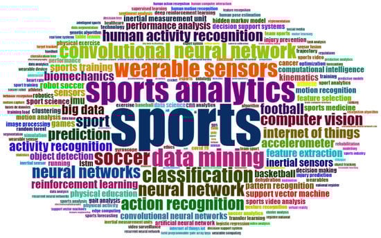 The 25 most frequently occurring author keywords can be manually grouped according to their meaning. The keywords “artificial neural networks”, “convolutional neural networks”, and “support vector machine” can be subsumed under the term algorithms (a). The keywords “inertial measuring units”, “wearable sensors”, “accelerometer”, “wearables”, and “sensors” can be assigned to measuring methods or tools (b). It is striking that all of these methods can also be used outside of laboratory settings in the field and make huge amounts of data relatively easily accessible, which favors the emergence of “big data” characteristics []. Specific AI tasks (c) are mapped with the terms “classification”, “activity recognition”, “action recognition”, and “prediction”. Different research fields (d) are mapped with the terms “sports analytics”, “computer vision”, “data mining”, “internet of things”, and “biomechanics”. Of the 25 most frequently occurring author keywords, only “soccer” and “football” name specific sports categories (e). A closer analysis shows that football is used synonymously with soccer in most of the publications included, in accordance with country-specific conventions. Other sports were also mentioned as specific keywords; however, their frequency was significantly lower. Thus, it can be seen that the sport of soccer/football is very dominant, which can also be explained by the significant financial interests behind this sport [].