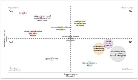 Figure 10 presents the corresponding thematic map of AI research in sports. The themes are divided into four quadrants by the horizontal and vertical dashed lines: motor/driving themes (upper right; Q2), basic/underlying themes (lower right; Q4), niche/very specialized themes (upper left; Q1), and disappearing or emerging themes (lower left; Q3). Themes in Q4—such as in general AI (inclusive of its subareas), different specific sports, and subfields of the AI pipeline—are basic, foundational themes that are very important for the field’s general development, characterized by high centrality but low density. Various measuring technologies (e.g., accelerometers, inertial sensors, gyroscopes) can be subsumed under the driving themes of Q2; this makes sense because they often provide complex data, making AI techniques more and more relevant due to static inference methods being limited in those contexts []. Looking at Q3, including the subsequent results of trending topics, sports medicine can be identified as an emerging theme. The themes of Q1 (e.g., “simulation”, “hidden Markov model”) are highly specialized and rare, creating internal bonds, as indicated by their low centrality but high density. The theme “performance analysis” is located between all quadrants, indicating that some aspects are basic and necessary for file development, some are emerging or declining, some are fundamental drivers, and some are highly specialized niche themes.
