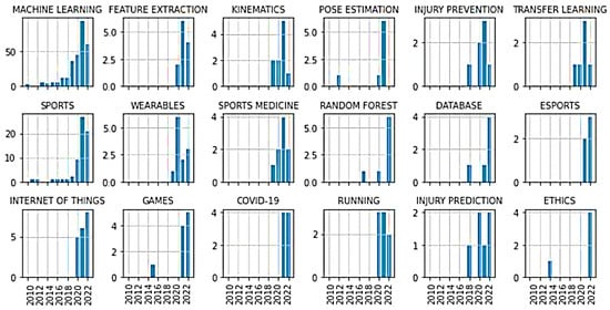 Trend topics using author keywords. Keywords are displayed that obtained more than 80% of their total count in the years 2020–2022. For comparison, the keywords “machine learning” and “sports” are additionally displayed on top. Each y-axis maps the total number of occurrences.