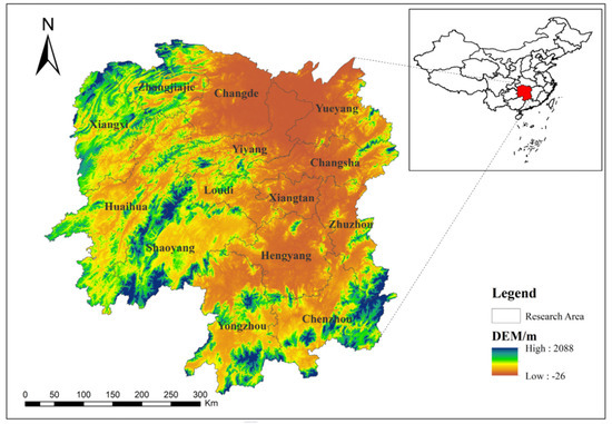 Hunan Province is a major water conservancy province in China (as shown in Figure 1), with 24.563 million people protected by dikes and 1733.8 thousand hectares of cultivated land. Moreover, 13,737 thousand reservoirs have been built in the province, with a total storage capacity of 54.545 billion cubic meters, and it accounts for more than 1/7 of the total number of reservoirs in the country. Basic water conservancy services in Hunan Province are led and managed by the government.