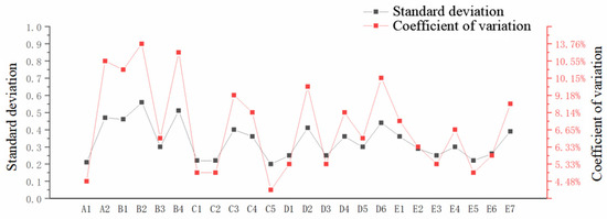 Indicators and weights were determined according to the methods described in Section 2.1 and Section 2.2. According to the construction principle of the evaluation index system, the main factors that affect grassroots water conservancy and the accessibility of data, this paper comprehensively constructs an evaluation index system of grassroots water conservancy service capacity in Hunan Province using five criteria: organizational structure, personnel quality, management level, public policy, and service capacity. By using qualitative and quantitative comprehensive evaluation methods. In total 24 representative indicators that reflect the current situation of the service capacity of various cities and prefectures in Hunan Province are selected; see Table 1 for specific indicators and algorithms. 24 indicators of the indicator layer were analyzed, 48 valid questionnaires were issued, and expert authority coefficients of the questionnaires were greater than 0.7. The final analysis results are shown in Figure 2 and Table 2. The average scores of final results are more than 4, the standard deviations are less than 0.57, the expert group’s indicators approval degree fluctuates slightly, and the coefficient of variation is less than 14%. Experts generally agree on the necessity of the index level of the evaluation index system, and it is feasible to implement the evaluation accordingly. The calculation results are shown in Table 3.