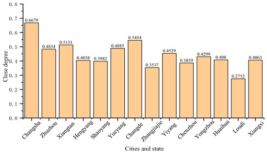 All data were normalized based on the established evaluation model of grassroots water conservancy services in Hunan Province, and the positive ideal solution, negative ideal solution, and comprehensive closeness of grassroots water conservancy services in 14 cities and prefectures in Hunan Province were obtained using the gray correlation TOPSIS method model; see Table 4 for specific values. Figure 3 shows the closeness of each city and prefecture.