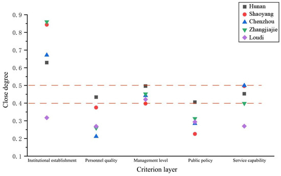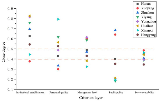 It can be seen from Figure 6 that there are obvious weaknesses in cities and prefectures with three service levels. Barring the evaluation of institutional establishment and service capacity, the comprehensive closeness Q of the other three dimensions is below the provincial average. In addition, in the evaluation of personnel quality and public policy, the comprehensive closeness Q of cities and prefectures with three service levels is less than 0.4, which is at a general level.