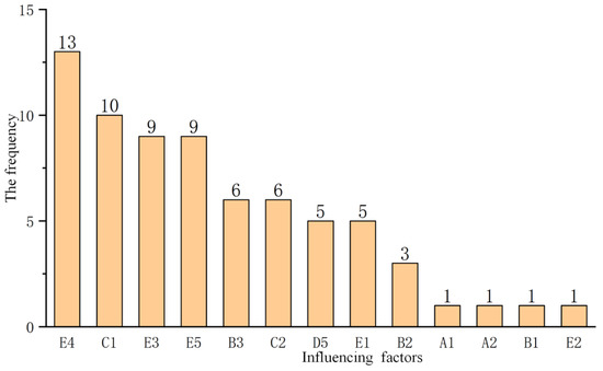 In order to analyze specific influencing factors, the top five obstacle factors are sorted according to the obstacle degree of individual indicators; these are then analyzed further to identify the weak points of grassroots water conservancy in cities and prefectures of Hunan Province, as shown in Table 6. The specific total frequency is shown in Figure 7.