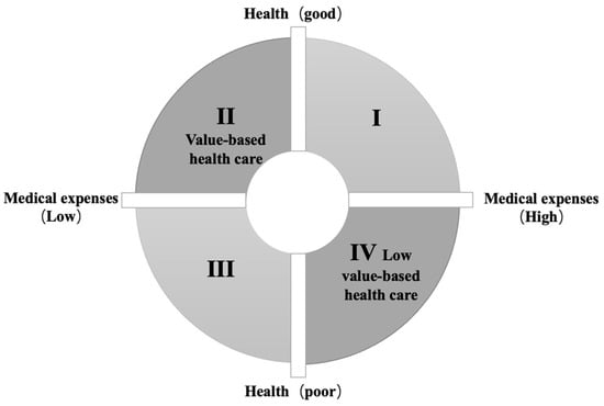 Can the challenges facing the medical care system be solved by simply controlling medical expenses? Obviously not. At the core of value-based health care is a need to balance the rational control of medical expenses sprawl against the protection of levels of health [15,17]. To illustrate this concept, we constructed a four-dimensional quadrant graph (see Figure 1) with patient health status and medical expenses as indicators. In the second quadrant, low medical expenses and high levels of health reflect value-based health care, while high medical expenses and low levels of health reflect low-value-based health care.