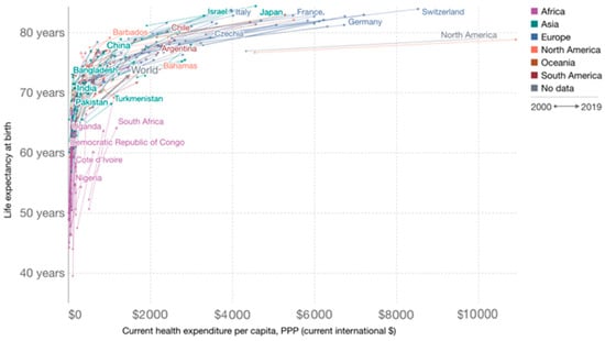 Trends in life expectancy and health expenditure by country, 2000–2019. Note: This visualization shows the cross-country relationship between life expectancy at birth (ordinate data) and healthcare expenditure per capita (abscissa). Arrows connect these two observations, showing the change over time of both measures for all countries in the world. China is at the intersection of low-value-based healthcare and value-based healthcare. Source: Image from https://ourworldindata.org/ (accessed on 20 May 2022).