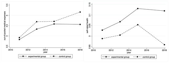 Time trends of out-of-pocket medical expenses (left) and self-rated health (right) in the experimental group and control group.