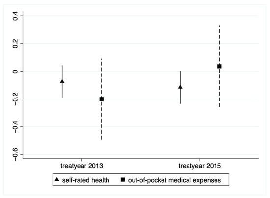 The PSM-DID method requires that the out-of-pocket medical expenses and self-rated health of the experimental and control groups maintain basically parallel time trends before the impact of the LTCI policy. Figure 3 preliminarily verifies the parallel trend test hypothesis. Further, it is necessary to be more rigorous to ensure that this study satisfies this hypothesis. Drawing on the approach proposed by Roth [70], the treat*after, treat*year 2013, and treat*year 2015 variables were added to the regressions simultaneously (we excluded treat*year 2011 to prevent multiple co-linearities). Specifically, year2013 had a value of 1 in 2013 and 0 in all other years, and year2015 has a value of 1 in 2015 and 0 in all other years. Figure 4 shows the coefficients and 95% confidence intervals of the three periods before the introduction of LTCI. The slope of each cross-term was around 0, indicating that before the LTCI policy implementation, there was no appreciable change in the difference between the two groups.
