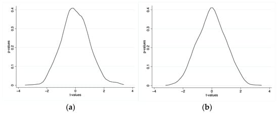 Placebo effect. (a) Out-of-pocket medical expenses: bandwidth = 0.2241 (Kernel: Epanechnikov); (b) Self-rated health: bandwidth = 0.2165 (Kernel: Epanechnikov). Note: The X-axis is the t-value, the Y-axis is the p-value, and the curve is the kernel density estimated distribution.
