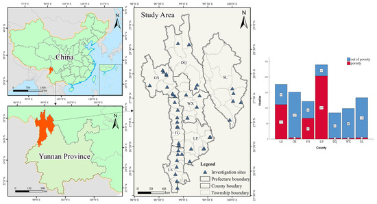 To sum up, the existing studies provide references for our study. However, there are still some deficiencies: first, although many scholars emphasize the importance of the follow-up development of the relocated people and put forward many measures to increase their income, few mention that the mutation of the man–land areal system and the resulting difficulty in adapting to the geographical environment are the root causes of the difficulty in the follow-up development of the resettled population and the risk of returning to poverty. Second, the current research mostly qualitatively discusses the adaptation of the resettled population to the social and cultural environment from the perspective of sociology and ethnology and the studies of quantitative evaluation of the resettled population’s geographical environment adaptation from the perspective of man–land relationship are rare. Third, China’s relocation policy applies to areas with fragile ecological environments, a lack of productive resources and difficulties in improving the living conditions of farm households, mainly in mountainous areas. Located in the Hengduan Mountains on the eastern edge of the Tibetan Plateau, Northwest Yunnan has significant geographical characteristics. First, it has a relocation population share of 14.5%, the highest in the country. Second, it has a remote national border with weak non-agricultural industries and a lack of infrastructure and public services. Third, there is a population of Tibetan, Lisu and other major ethnic minorities with low cultural quality and a tradition of living by the mountains. These factors add to the difficulties of population relocation and subsequent poverty eradication. This region has the characteristics of large-scale relocation and a high risk of returning to poverty, which should have been paid particular attention to.