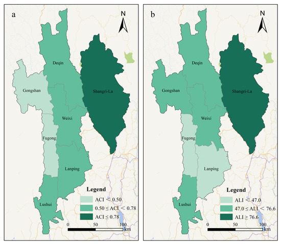 AC is an inherent determinant of AL. In theory, the two will show consistency, that is, if AC is weak, AL is also low. Through quantitative analysis, it was found that the linear correlation coefficient of the two indices was 0.833, indicating that there was a high positive correlation between the two indices, which was statistically significant. However, under the disturbance of external factors such as policies and national culture, the relationship between the two in some regions may also deviate from the overall trend. The AC and AL were divided into three grades with as the classification mark. The AC and AL of the resettled population are consistent in Fugong County, Lushui City, Deqin County, Weixi County and Shangri-La City, while the two indicators of Gongshan County and Lanping County deviate from the overall trend: the AC of the resettled population in Gongshan County is “weak”, but the AL is “medium”, while Lanping County is the opposite, as shown in Figure 4.