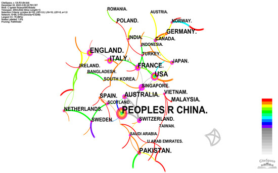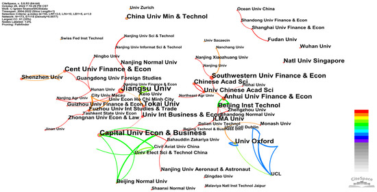 - There is a lack of close cooperation between domestic institutions with important contributions to the field of green finance, and the degree of communication is relatively low. Compared with domestic institutions, the number of publications of international influential institutions is less, but international influential institutions are closely connected, and a certain scale of cooperation network has formed.