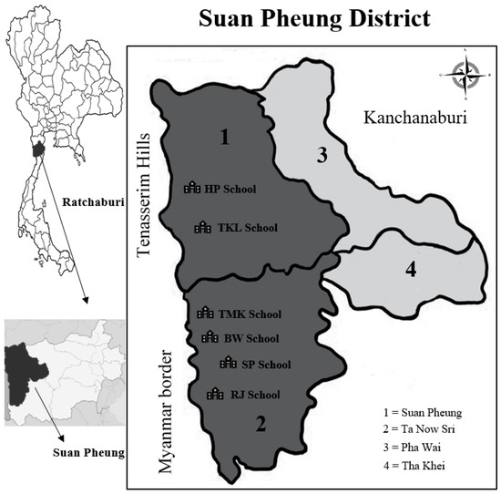 This cross-sectional study included children aged 4–12 years from six primary schools in Suan Pheung district, Ratchaburi province, near the Thai-Myanmar border, a natural border in western Thailand (Figure 1). Ratchaburi province is divided into 10 districts. Suan Pheung district, which has important natural resources, is the most popular. The forest covers an area of 1711 km2, or 33% of the provincial area. The area is part of the Tenasserim Hills and the Tanintharyi division of Myanmar. The population in this area have low income and education levels. Most people are agriculture employees and construction laborers and some are unemployed. They commonly consume rainwater, stream water, and water from community wells. Fecal samples were collected from children from HP School, TKL School, RJ School, TMK School, SP School, and BW School, which are located in different sub-districts and are all government primary schools.