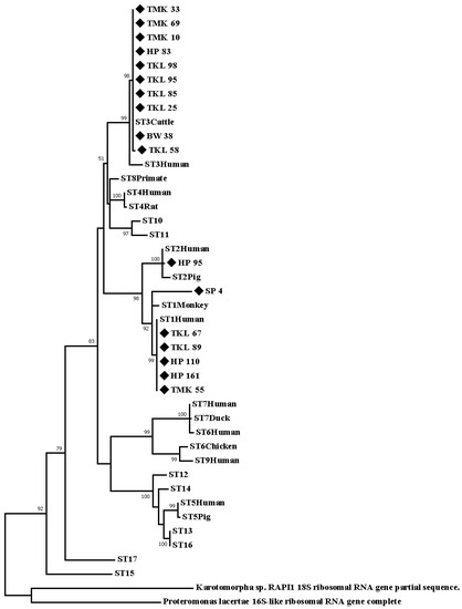 Blastocystis-positive samples were sequenced on an ABI 3730x1 automated DNA sequencer. The nucleotide sequences were aligned and compared with reference sequences available in the GenBank database using BLAST (http://blast.ncbi.nlm.nih.gov/, accessed on 5 May 2022) for subtype identification. The blastocystis 18S allele database was tested at http://pubmlst.org/blastocystis/, accessed on 10 May 2022). All 17 nucleotide sequences and reference sequences (ST1-ST17) were manually edited using BioEdit version 7.2.5 (Ibis Biosciences, Inc., Carlsbad, CA, USA) and multiply aligned using the ClustalW programs. Phylogenetic analysis was performed using MEGA version 7. A phylogenetic tree was constructed using the Tamura92+G+I model with the maximum-likelihood algorithm and was tested with 1000 bootstrap replicates.