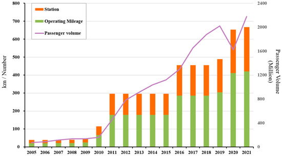 As one of the rapidly developing cities in China, due to the rapid expansion of the transportation industry and the growth of the urban population (from 8.3 in 2005 to 17.6 million in 2020), Shenzhen is facing major environmental challenges that are similar to other megacities in China [5]. Specifically, the mileage of the metro system in Shenzhen has expanded from 20.9 km at the end of 2004 to 419 km in 2021. By the end of 2021, a total of 11 lines and 265 stations (excluding MTR line 4) had been completed and put into service. Passenger volume has also increased from 730,000 in 2005 to 2.18 billion in 2021, as shown in Figure 1. As a large-capacity and highly punctual public transportation mode, the metro system alleviates not only urban traffic congestion and improves the convenience of urban public travel, but also introduces significant challenges regarding the urban environment, energy security, and public health [6,7,8]. In the future, Shenzhen Metro will continue to promote new road network planning and construction [9]. Given the importance of this metro system, methods for reasonably quantifying and predicting its carbon emission, and exploring the potential for reducing emissions, are problems that urgently need to be solved.