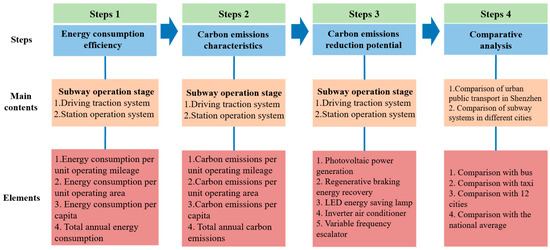Therefore, with the aim of meeting this unmet need, this study adopts the life-cycle assessment (LCA) method, selects the CO2 equivalent (CO2e) as the environmental impact assessment index, takes the metro operational stage as the research object, constructs a carbon emissions assessment method for the metro operational stage, and quantitatively analyzes energy consumption and the carbon emission intensity and level for metro operation. By comparing these indicators with those of other public transportation systems (buses and taxis) in Shenzhen and with the metro operations in other cities, the carbon emissions level of Shenzhen Metro operation is clarified. Finally, using the scenario analysis method, the carbon emissions of Shenzhen Metro in the operational period of 2022 to 2035 and the degree of achievable carbon emission reduction by implementing energy-saving and emission-reduction measures are predicted. The research results can provide theoretical methods and data references for researchers related to reducing the carbon emissions of the metro system, as well as a theoretical basis and data support for green and low-carbon transformation in the transportation field and a scientific formulation of the energy-saving management policies of the metro system by relevant government departments.