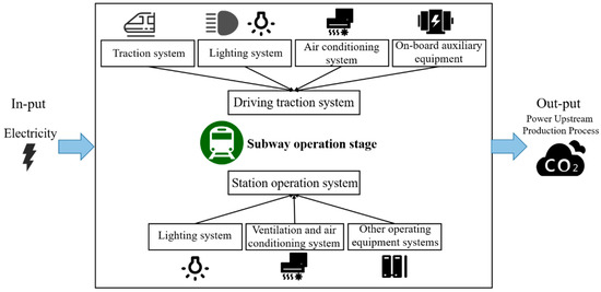 Following the principles of ISO 14040/44 [39,40], this study selected CO2 equivalent (CO2e) as the environmental impact assessment index in order to assess the environmental impacts of metros in the operational stage from the perspective of the whole life cycle. The system boundary of the metro operational stage includes the driving traction system and the station operation system, as shown in Figure 3. In the operational stage of a metro, electricity consumption is the main factor affecting emissions, including traction consumption and the use of on-board auxiliary equipment (ventilation and air conditioning system, broadcasting system, information system, etc.). As for station operation, it mainly includes power, ventilation, air conditioning, and lighting systems but does not include the energy consumption of commercial blocks. Driving traction includes traction consumption and the use of auxiliary equipment (ventilation and air conditioning system, broadcasting system, information system, etc.); station operation mainly includes ventilation and air conditioning and lighting systems, but does not include energy consumption in commercial blocks. Unlike diesel and gasoline, electricity, as it is used here, is considered green energy and does not directly generate greenhouse gases. Therefore, to quantify the environmental impacts of the metro operational stage, it is necessary to calculate the carbon emissions generated by the upstream production stage of the electricity consumed by the various equipment and systems during the metro’s operational stage. In addition, the time boundary of this study is 2005–2021, as the Shenzhen Metro was officially opened on 28 December 2004.
