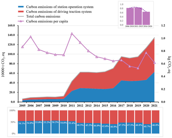The carbon emissions of the metro during operation are positively correlated with the intensity of electricity consumption. As shown in Figure 4, from 2005 to 2021, the carbon emissions of the metro operations showed a step-by-step growth, and its comprehensive energy consumption and carbon emissions increased from 60 million kWh (63,000 t CO2e) in 2005 to 1.72 billion kWh (1.3 Mt CO2e); in other words, carbon emissions increased by a multiple of about 21. The historically accumulated carbon emissions of the Shenzhen Metro are 9.5 Mt CO2e. From 2005 to 2021, the carbon emissions of the metro station operation system and the driving traction system accounted for 49% and 51%, respectively. It can be seen from Figure 4 that the carbon emissions of the driving traction system and the station operation system both surged in the same years. For example, the carbon emissions of the driving traction system and the station operation system increased from 54,000 t CO2e and 65,000 t CO2e in 2010 to 333,000 t CO2e and 289,000 t CO2e in 2012, respectively. According to the analysis, the carbon emission factor of electricity from 2005 to 2021 showed little change from one year to the next. The reason for the significant increases in carbon emissions during these years is the increases in the operating mileage and number of stations of the Shenzhen Metro, with the opening of new metro lines and extension lines in 2011, 2016, and 2020 (as shown in Figure 1). The energy consumption of a driving traction system increases with the increase in metro operating mileage, and the area devoted to stations increases as more stations are added, so more energy is consumed in maintaining the temperature and humidity of the station space, resulting in a significant increase in the total energy consumption of the metro operation.