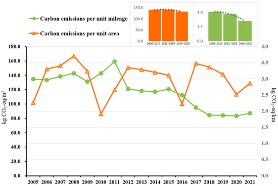 Carbon emissions per unit operating mileage and per unit area of Shenzhen Metro from 2005 to 2021.