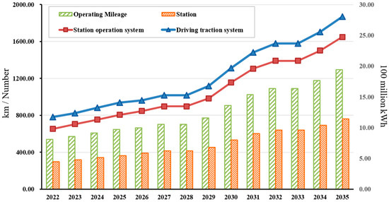Based on Shenzhen Rail Transit Network Planning (2016–2035), Shenzhen Urban Rail Transit Phase IV Construction Planning, and its adjustment scheme (2017–2022), this research characterized the general situation of Shenzhen Metro planning and construction lines in the short term, medium term, and long term and then forecast the operating mileage and the number and scale of stations in the Shenzhen Metro system over the period of 2022–2035. Then, based on the electricity consumption per unit mileage and per unit station area, the electricity consumption required for metro operation in the future was estimated (as shown in Figure 6). On this basis, we then discussed the effectiveness of energy-saving and emission-reduction measures and analyzed and evaluated the carbon emission reduction potential of these measures.