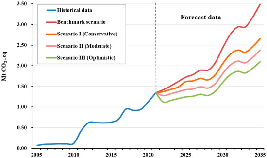 Compared with the benchmark scenario, the 2025 carbon emissions of Scenario I (Conservative), Scenario II (Moderate), and Scenario III (Optimistic) are estimated to be 1.61, 1.42, and 1.25 Mt CO2e, respectively, and the carbon emission reductions are estimated to be 0.11, 0.3, and 0.48 Mt CO2e, with decreases of 6%, 21%, and 38%, respectively.