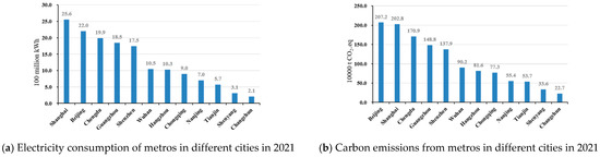 Metros are an important part of an urban public transportation system and one of the main sources of carbon emissions (for example, the total carbon emissions from metro operations in Shenzhen accounted for 56.1% in 2021). In this study, the results of energy consumption and carbon emission intensity during metro operations in Shenzhen in 2021 were compared with those from some domestic cities (as shown in Figure 9). A total of 12 domestic cities were selected for comparison; these included four first-tier cities (Shanghai, Beijing, Guangzhou, and Shenzhen) and urban areas in East China, South China, North China, Central China, Northwest China, and Northeast China. See Table 3 for the metro information of the selected cities.