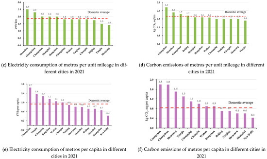 Overall, in 2021, the Chinese national metro operation consumed 21.3 billion kWh of electricity, and the total carbon emissions were about 19.1 Mt CO2e. As can be seen from Figure 9a,b, Beijing, Shanghai, and Guangzhou were the top three cities for China’s energy consumption and carbon emissions, accounting for more than 30% of the country’s totals. Although the power consumption in Shanghai was higher than that in Beijing, the carbon emissions in different regions were reversed due to the differences in the power carbon emission factors. As for energy consumption and carbon emission intensity of metro operation, this study compared these figures per unit operating mileage with per capita energy consumption and carbon emission indicators. As shown in Figure 9c,d, in 2021, the national average electricity consumption per unit operating mileage was 1.9 kWh/km, and a total of five of the cities studied had values higher than the national average. Among these, Shenzhen and Guangzhou were the largest, with 2.5 kWh/km and 2.3 kWh/km, respectively, and Changchun was the third. As for the carbon emissions per unit mileage, only three cities exceeded the national average value of 1.7 kg CO2e/km, with Shenzhen ranking second after Changchun. The energy consumption and carbon emissions per unit operating mileage are directly related to the traction electricity consumption and the operating mileage of the trains. The geographical layout of the metro lines, the vehicle weight, the use of energy-saving technology and other factors all affect the energy consumption and carbon emissions of a train. The passenger volume also affects the number of metro trains, as well as the operating mileage. For per capita energy consumption and carbon emissions, as shown in Figure 9e,f, the per capita electricity consumption of the Shenzhen Metro was lower than the national average of 0.9 kWh per capita; Changchun, Tianjin, and Chongqing occupied the top three in China. Comparing the per capita carbon emissions, Shenzhen’s emissions in 2021 were 0.6 kg CO2e/km, slightly lower than the national average (0.8 kg CO2e/km). The per capita energy consumption and carbon emissions are directly related to the total electricity consumption and passenger volume of a metro. The size of the metro system, in turn, affects the total energy consumption, and the passenger volume is also affected by the geographical layout of the lines.