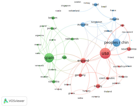 The USA (80 documents), Spain (62 documents) and China (46 documents) were the three most prolific countries/regions among the 48 co-authored countries/regions found, leading each of the three most important publication clusters. By the number of citations, the USA (3678), Spain (1419) and England (1003) were the most influential countries/regions. The USA led the most prolific cluster, publishing with countries/regions such as England, South Korea, Turkey, Iran, and Germany. China led other important publishing clusters, publishing with Australia, Vietnam, Canada, and Israel. Meanwhile, Spain led a publication cluster with countries/regions such as Italy, the Netherlands, Portugal, Belgium, and many Spanish-speaking countries (Mexico, Colombia, Ecuador, etc.), and it was the country/region with the highest number of collaborations with other countries/regions (15), followed by the USA (14) and England (13). Figure 3 (graph with fractionalization analysis: attraction: 8; repulsion: 0; clustering resolution: 0.5; colour: cluster; size node: documents) shows the clusters formed by the countries/regions; while Figure S2 shows the average number of citations for every country/region (graph with fractionalization analysis: attraction: 8; repulsion: 0; clustering resolution: 0.5; colour: average of citations; size node: documents).