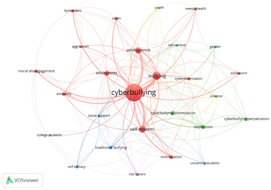 A total of 778 concepts were found in the co-occurrence analysis of keywords used by the authors. After applying Zipf’s law, it was estimated that the most frequent keywords should be a number equal to or less than 28 (square root of 778). Thirty-six words were found with six or more occurrences, and 27 were found with seven or more. These last ones were taken as those of most interest to the authors. Figure 4 shows the 27 keywords most used by the authors (graph with fractionalization analysis: attraction: 6, repulsion: −2, size node: number of occurrences, colour: cluster). The terms “cyberbullying” (233 occurrences) and “bullying” (58 occurrences), terms such as “self-esteem” (44), “adolescents” and “adolescence” (37 and 26, respectively), and “depression” (19) were the most used. Concepts such as Cyberbullying victimization, Cyberbullying perpetration, moral disengagement, or university students presented the most recent mean years of publication, being terms of current interest (Figure S4).