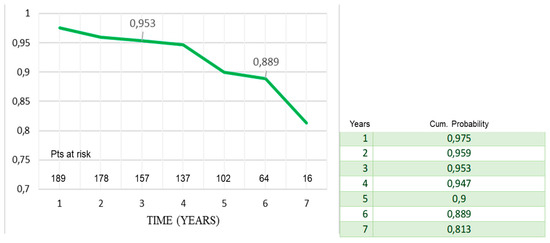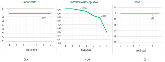 During follow-up, there were 10 deaths out of 212 patients (4.7%); of them, two patients died for cardiac causes, i.e., endocarditis and congestive heart failure. At seven years, actuarial survival was 93% ± 2% (Figure 1) and adverse-event-free survival was 81% ± 5% (Figure 2). Freedom from death from cardiac causes was 99% ± 1%, from endocarditis–redo operation, 86% ± 5%, and from stroke, 99% ± 1%, respectively (Figure 3a–c).