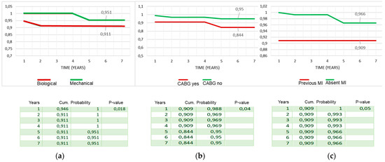 Survival stratified by biological vs. mechanical prostheses (a); concomitant CABG (b); presence of previous MI (c) (log rank, Mantel–Cox test). CABG: coronary artery bypass grafting; MI: myocardial infarction.