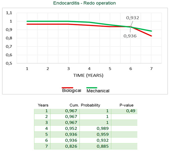 Freedom from endocarditis–redo operation stratified by biological vs. mechanical prostheses valved conduits (Mantel–Cox test).