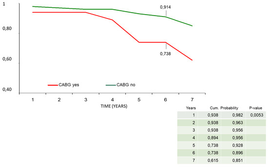 Adverse-event-free survival stratified by concomitant CABG (Mantel–Cox test). CABG: coronary artery bypass grafting.