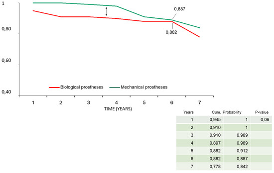 In the Cox regression analysis, concomitant CABG during the Bentall operation was the only independent predictor for reduced survival (HR = 1.9, p = 0.04) and event-free survival (HR = 2.3; p = 0.02). All the other variables mentioned in the statistical section of the methods, including age and the type of valve disease, i.e., steno-insufficiency or isolated insufficiency of the aortic valve, were not identified in the Cox analysis as risk factors for reduced survival and event-free survival. In the Mantel–Cox log-rank test, late survival was affected by CABG (84% ± 8% vs. 95% ± 2%, p = 0.04), preoperative myocardial infarction (91% ± 9% vs. 97% ± 2%, p = 0.02), and biological vs. mechanical prostheses valved conduits (91% ± 9% vs. 95% ± 3%, p = 0.02) (Figure 4a–c). Freedom from endocarditis–reoperation was 83% ± 9% for biological vs. 89% ± 6% for mechanical prostheses valved conduits (p = not significant) (Figure 5). Overall event-free survival also was affected by CABG (62% ± 14% vs. 85% ± 5%, p = 0.005) (Figure 6) and, although with a statistical value that does not reach significance, by the use of biological prostheses (78% ± 8% vs. 84% ± 6%, p = 0.06) (Figure 7).