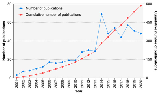 Only studies designated as “article” were included, covering all types of studies. Other document types such as meeting abstracts and letters, were excluded. The critical information (i.e., titles, abstracts, journals, countries/regions, institutions, and cited references) were comprehensively collected. Only studies that were published in English were considered. Finally, a total of 586 records published during the period 2001–2020 met the inclusion criteria.