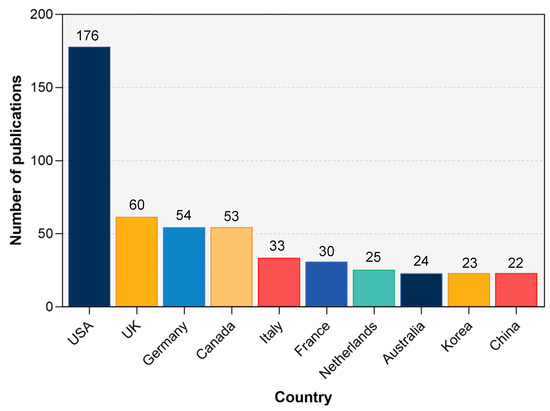 The top 10 most contributive countries within rhythmic auditory stimulation research. Alt text: A column graph demonstrates the ten most productive countries within rhythmic auditory stimulation research. The United States accounted for around 30% of total publications.