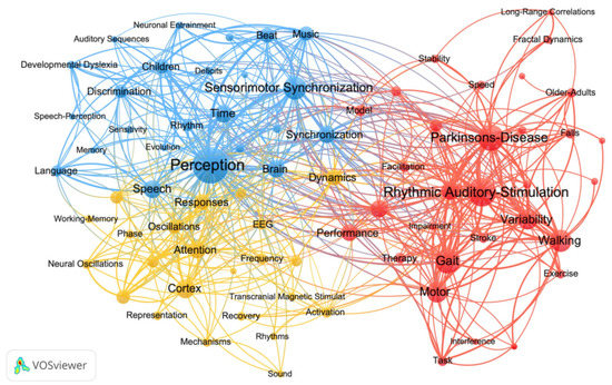 Visualization of the keywords co-occurrence analysis on rhythmic auditory stimulation research. Alt text: A clustering graph is plotting the research topics within rhythmic auditory stimulation research. There are three themes: motor dysfunction, cognition, and perception.