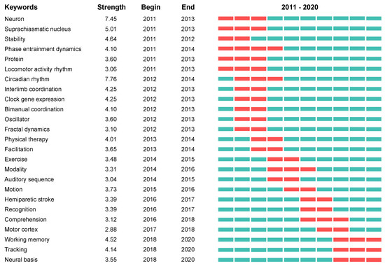 Burst detection was applied to investigate the research hotspots further. Burst keywords can be identified as indicators of emerging trends [42]. Figure 5 presents keywords with the 25 strongest citation bursts between 2011 and 2020. The most recent burst keywords were working memory, tracking, and neural basis.