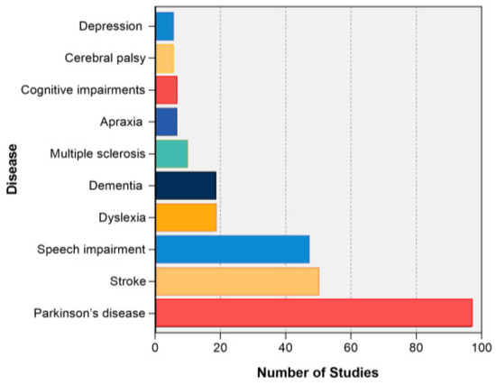 Clinically, RAS has been widely applied as a rehabilitation strategy. According to the analysis of high-frequency keywords, PD was the most focused disease within RAS research (Figure 6). A total of 97 publications focused on PD. Stroke and speech impairment ranked second and third with 50 and 47 publications, while the other six were well below: dyslexia (18 articles), dementia (18 articles), multiple sclerosis (10 articles), apraxia (6 articles), cognitive impairments (6), cerebral palsy (5 articles), and depression (5 articles). All the diseases were neurological and psychiatric disorders.