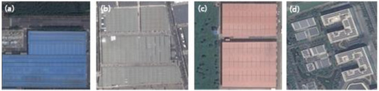 Examples of different types of industrial parks: (a) metal rooftops, mainly in blue; (b) concrete rooftops, mainly in grey; (c) clay rooftops, mainly in dark or red color; (d) concrete rooftops, which have a smaller occupied area compared with the former three types.