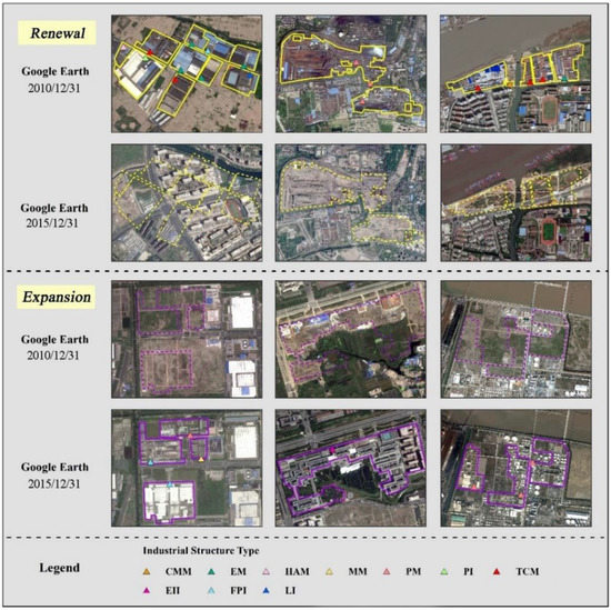 Visual examples of industrial changes (renewal or expansion) in GE images during 2010–2015.