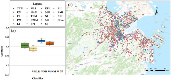 Industrial structure classification results based on industrial POIs: (a) accuracies of four models, (b) intra-structure classification result of UAHB.