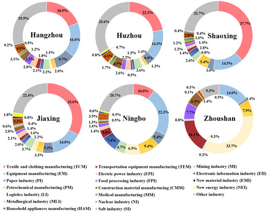 Due to the influences of natural conditions, resource distribution, and policy guidance, there have been obvious regional divergences of industrial structure types between different cities across the UAHB. The industrial structure of each city has formed with local characteristics. For instance, the textile industry is a traditional pillar industry in the cities of Jiaxing, Huzhou, and Shaoxing; the logistics, advanced equipment, and household appliance industries play important roles in Ningbo; the logistics industry also plays a significant role in Zhoushan; and Hangzhou has become famous for the electronic information industry in recent years.